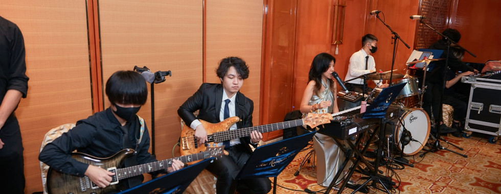 For the first time, we were involved with the wedding solemnization and the banquet, both held at The Murray Hong Kong. The Arches is a spacious semi-outdoor area with iconic big fans. It is a distinctive area to have a wedding ceremony and a cocktail reception. The Niccolo Room is a stylish and modern function room with two cutting-edge LED panels for projecting fruitful memories during the dinner. Our team performed some songs in both areas for the wedding solemnization and the wedding banquet to enrich the atmosphere for Karman and Ivan and our beloved guests.